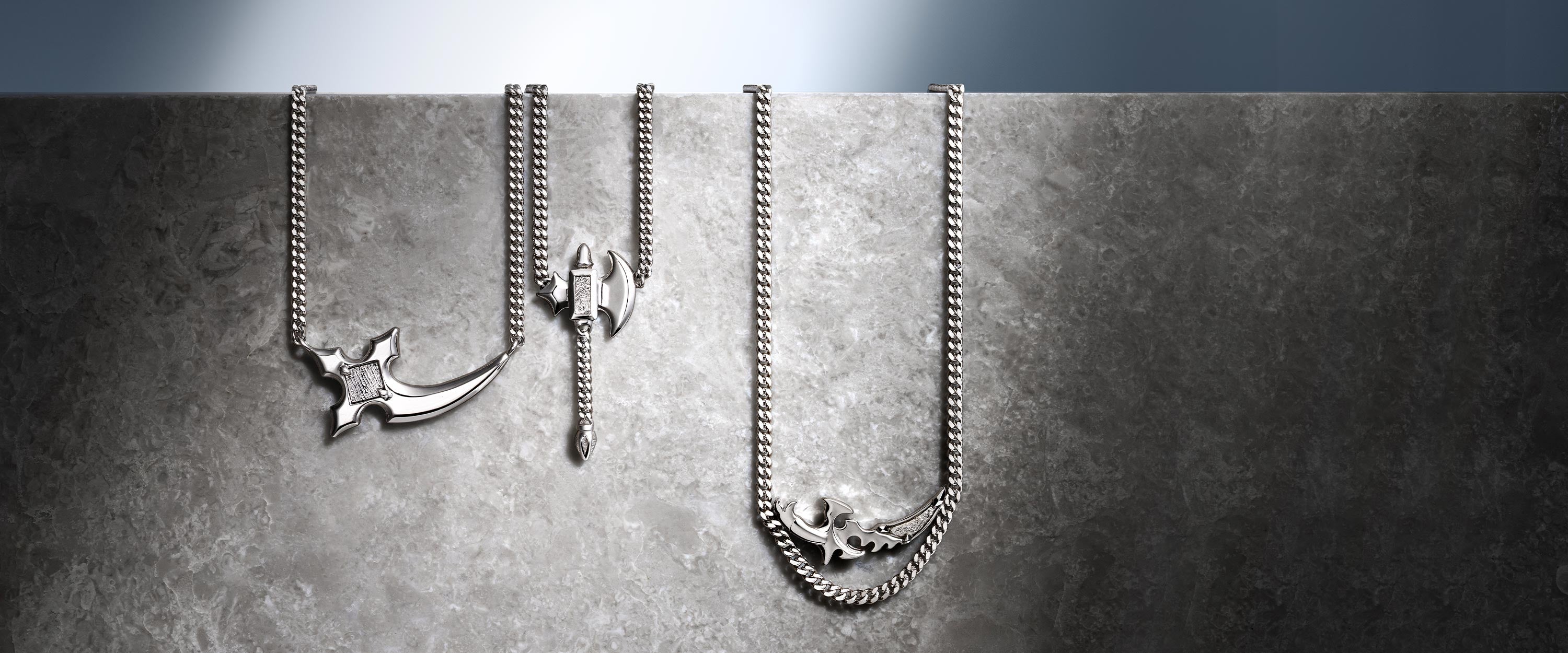 ネックレスのモチーフとなったのは、古代で用いられた兵器「戈(か)」です。戈は紀元前から青銅器時代にかけて発達した独特の武器であり、長柄の先に横向きの刃を取り付けた形状から、敵を引き倒し、薙ぎ払う戦法に用いられました。後に儀礼用の祭器としても重用され、権威と武威の象徴として王墓に副葬されてきた歴史を持ちます。その鋭く弧を描く刃の曲線は、荒れ狂う炎のような力強さと、洗練された美しさを同時に湛えています。