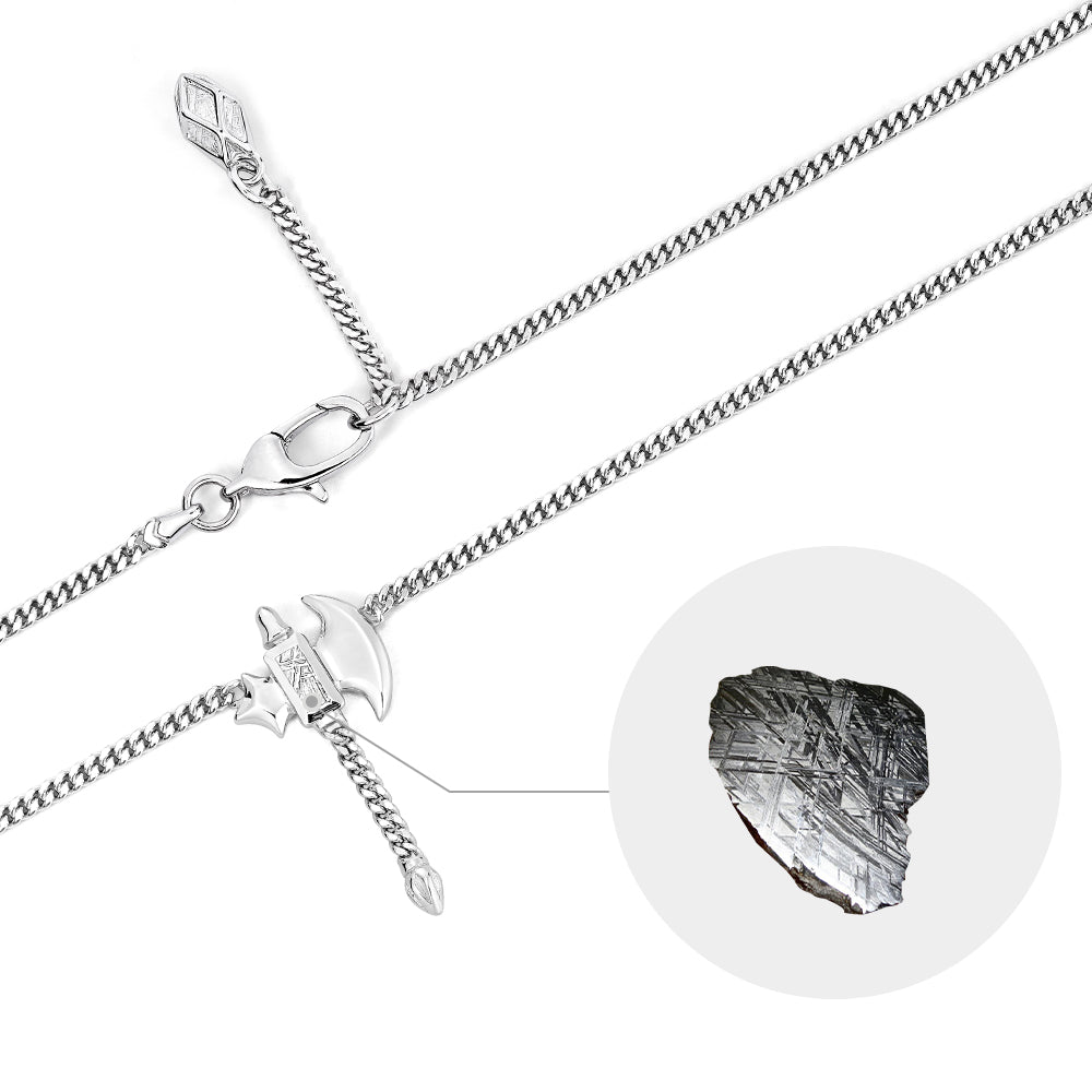中央の斧型ペンダントには、約45億年前の太陽系誕生期に形成されたスウェーデン・ムオニオナルスタ隕石を使用。星間を旅し、極寒と高圧を経て地表に落ちたその内部には、無重力環境でしか生まれないウィドマンシュテッテン構造が刻まれています。東方神話の「月鉞の影」と融合し、時空を超える護符として昇華しました。