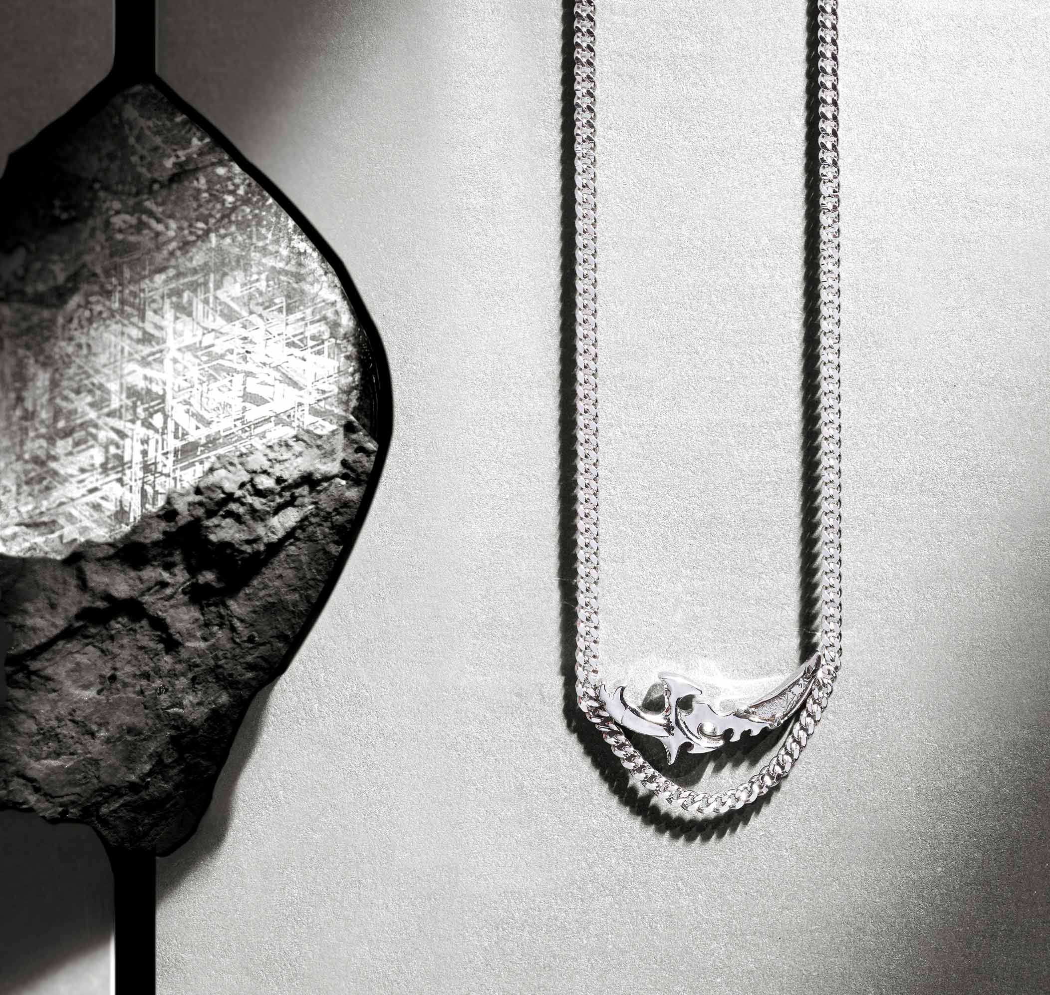 着用時、隕石の冷ややかさとシルバーの温もりが響き合い、心地よい重量感をもたらします。斜角カットのチェーンは光を受けて繊細に反射し、動きに合わせて抑制された輝きを放ちます。浮遊感のあるセッティングが胸元に立体的な存在感を与えます。