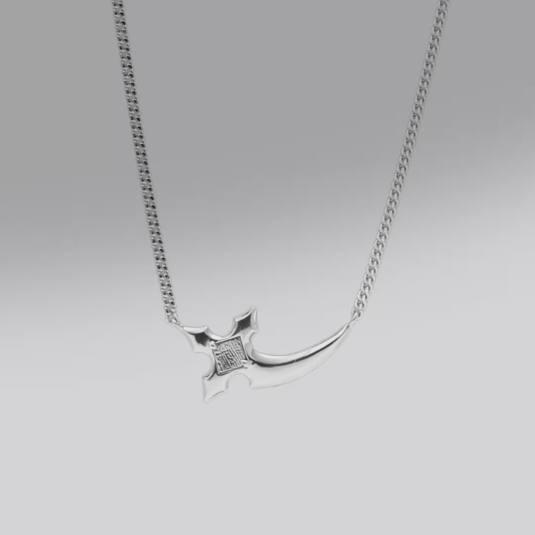デザインは古代兵器「戈」に着想を得て、幾何学的ラインで再構築。戈は攻撃よりも守護と節制を象徴し、「動かずして制す」東方の智慧を体現します。シルバー925は鏡面仕上げで冷ややかな光沢を放ち、斜めに構えたフォルムが静中に動を孕む緊張感を生みます。
