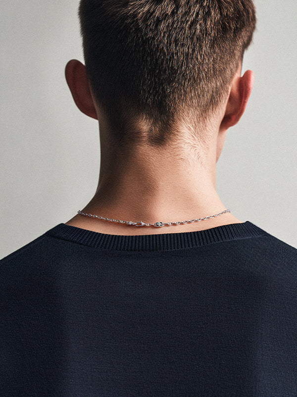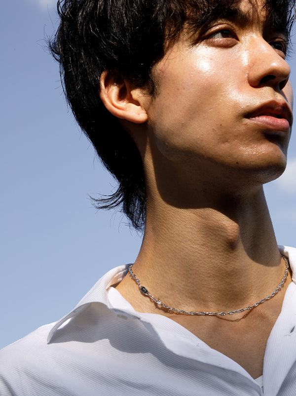 左右非対称のシルバーフィガロチェーンは時間の刻みを思わせるデザインです。長短が交互に連なる構造はリズムを生み、単なる連結の役割を超えて意匠の一部となっています。表面は特別な研磨加工を施し、光を浴びると冷徹な刃のような鋭さと月光のような柔らかさを同時に放ちます。