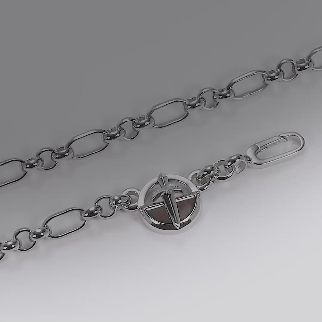 クック諸島の深海で長い年月をかけて形成されるその貝は、漆黒の地に虹色の光沢を宿し、唯一無二の生命の軌跡を刻みます。切片に残る模様はすべて異なり、世界に同じものは存在しません。中央の十字剣モチーフは、ペンダントを四分割する大胆な造形であり、方向性と決断を象徴します。