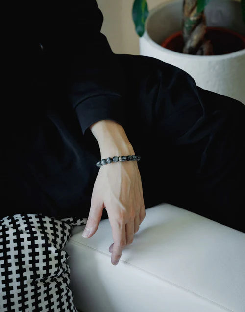 ブレスレットは10mmのビーズに多面カットを施し、各石の特性を最大限に引き出しています。漆黒のオニキス、深い赤褐色のタイガーアイ、銀色の光彩を放つオブシディアンが交互に配され、モノトーンを基調としながらも複雑な表情を生み出します。調節可能な編み紐仕様が手首にフィットし、スターリングシルバーのビーズがアクセントを添えます。