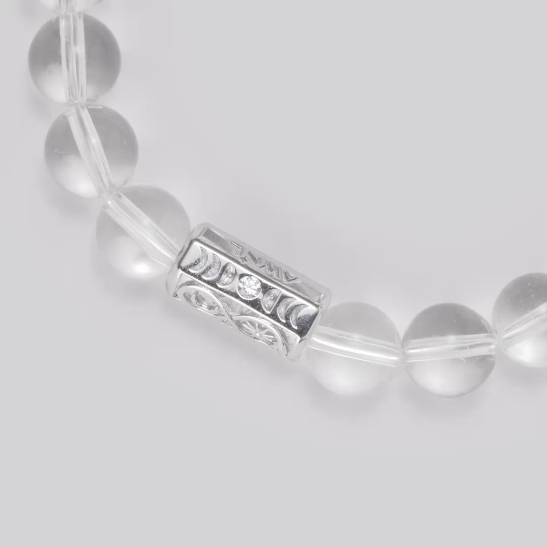 ブレスレットの中心には、スターリングシルバーのシリンダーを据えました。刻まれているのは、永劫の循環を象徴する「ウロボロス」と無限の記号、そして月の満ち欠け。ヘアライン加工によるマットな質感と、鏡面仕上げの鋭い光沢が交錯し、微細なレリーフに深い陰影を落としています。