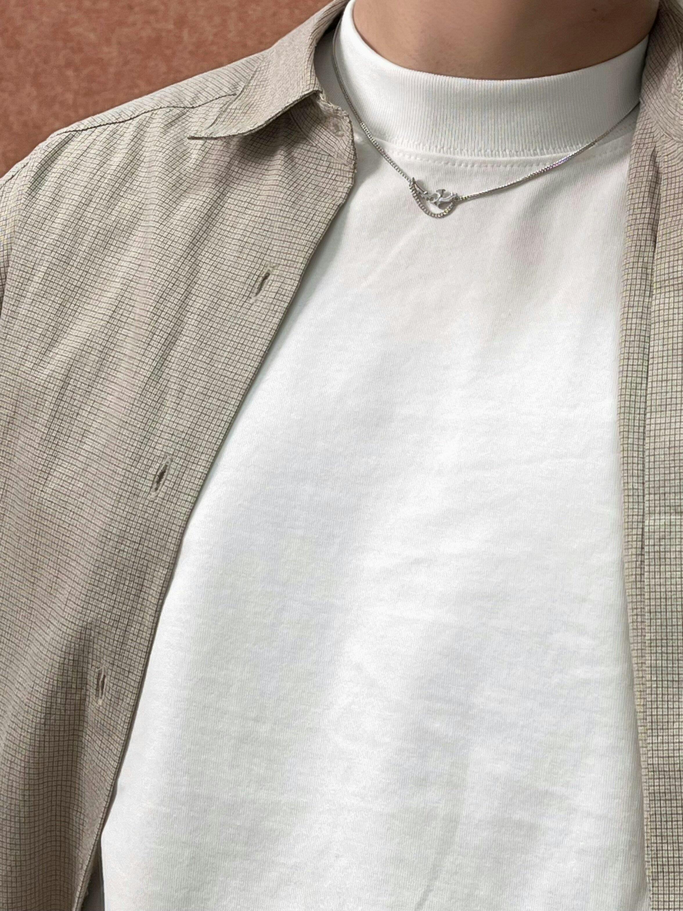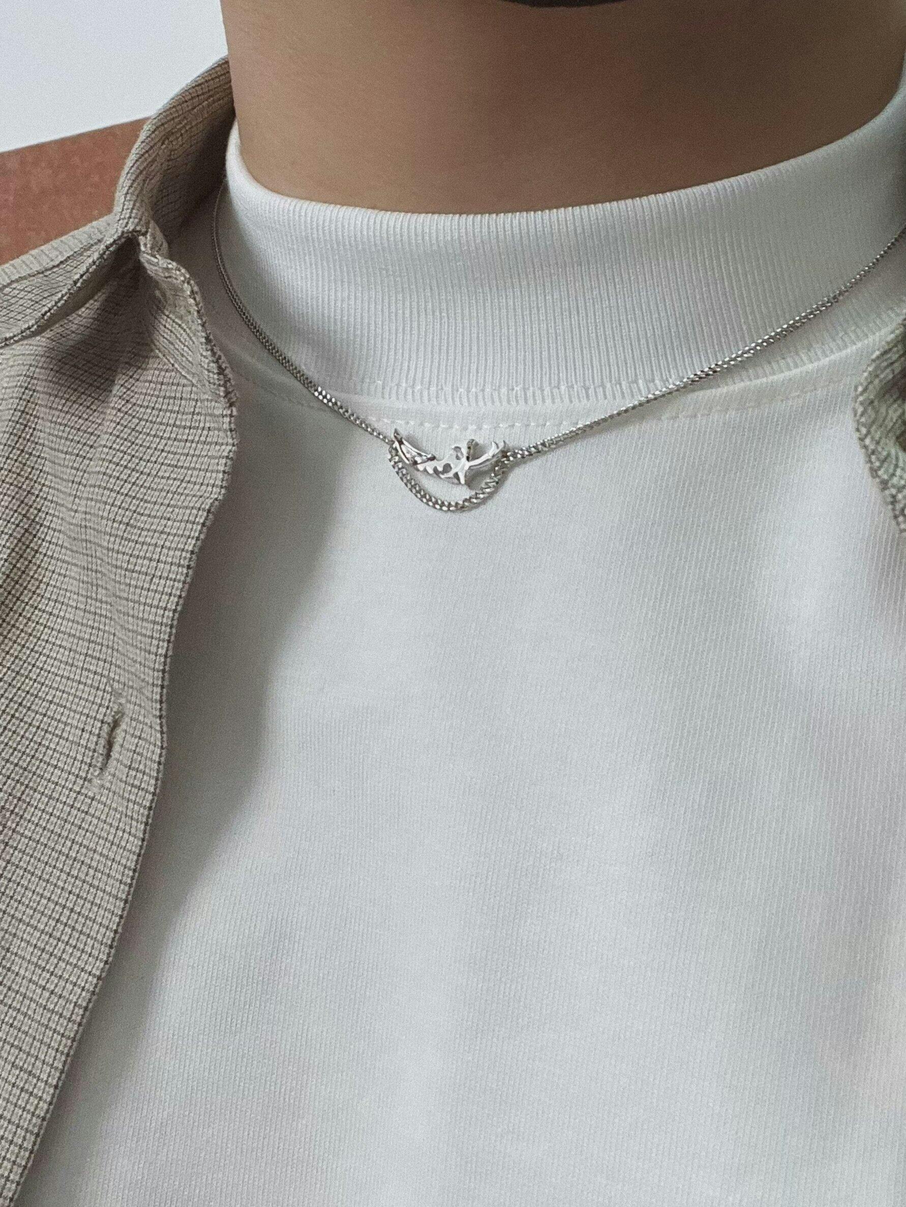 鎖骨のラインに沿う高い位置で、横一文字に走るシルエットが特徴です。様式化された刃(ブレード)の意匠が喜平チェーンの流れに継ぎ目なく溶け込み、建築的で美しいラインを描き出しています。