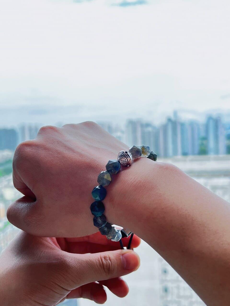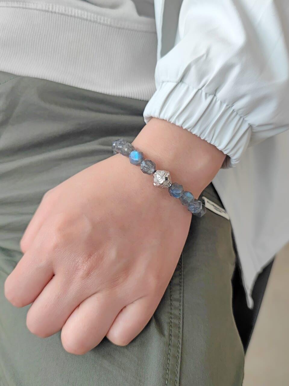 石に現れる青や緑の光彩は一粒ごとに異なり、光の角度や手首の動きによって色彩が変化します。調節可能な編み紐仕様は手首にフィットし、快適な着用感をもたらします。スペクトロライトの神秘的な輝きはカジュアルな装いに個性的なアクセントを添え、グレーやネイビーのニットと合わせることで、北欧的な洗練を演出します。