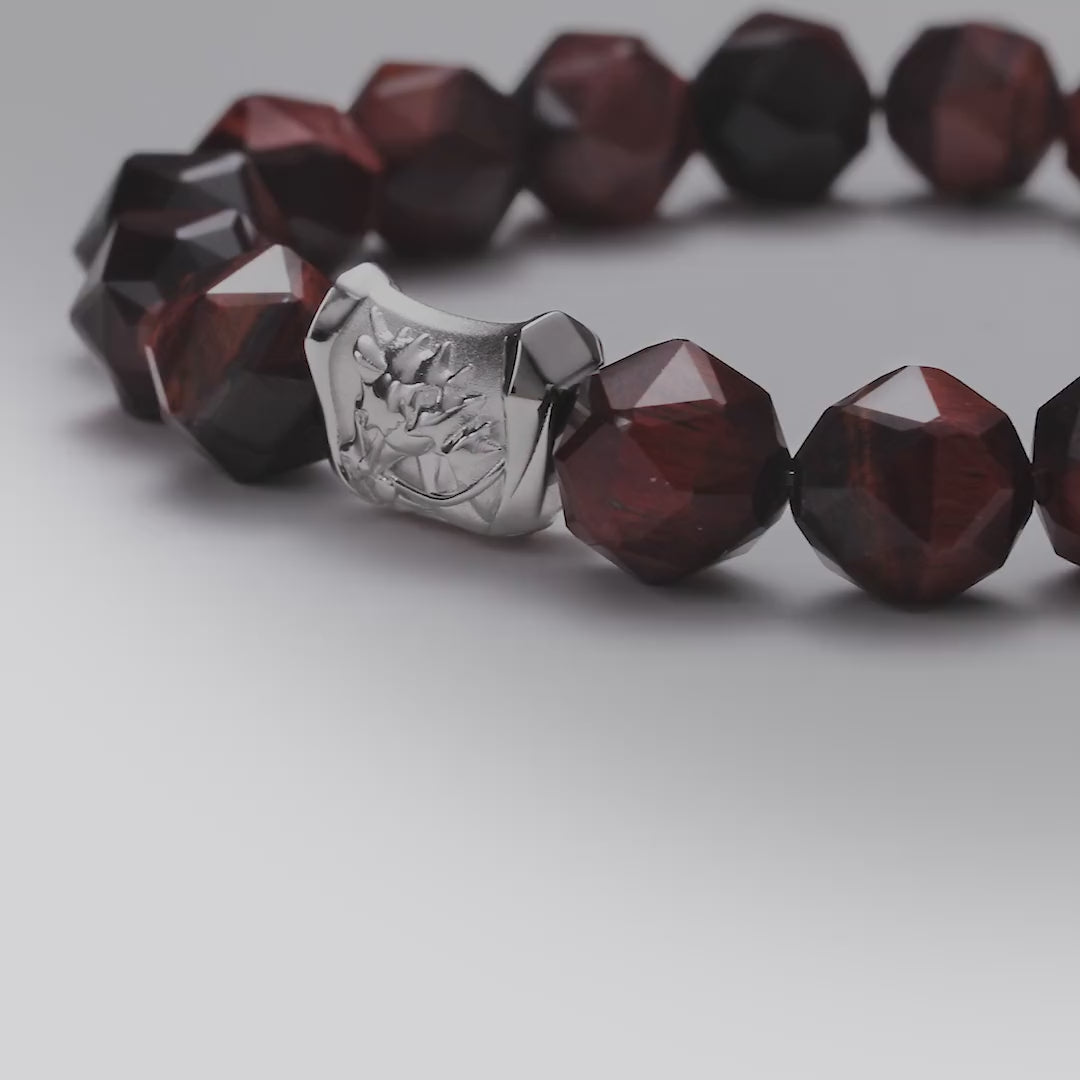 シルバーエレメントには幾何学的なファセットカットと、馬の動きを描いたレリーフワークが施されている。レッドタイガーアイのビーズは、それぞれ84ファセットカットを施され、光が横切るときに穏やかな猫目効果を伴う特徴的な垂直の条線を示す。精密なカッティングにより、長時間の着用に適した滑らかな表面を確保している。
